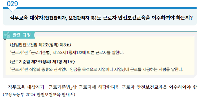 👉 따라서 안전관리자, 보건관리자도 근로자에 해당한다면 근로자 안전보건교육을 이수해야 합니다.
