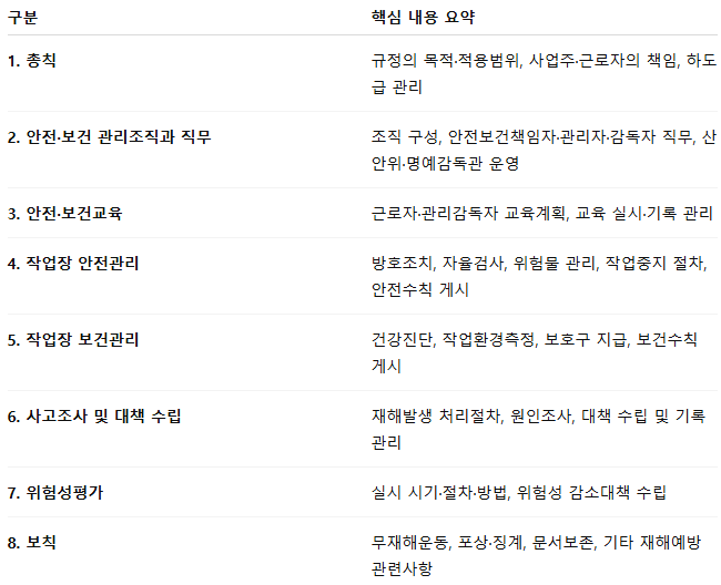이 규정은 총 8개 항목으로 구성되며, 각 항목에는 총칙, 관리조직과 직무, 안전·보건교육, 작업장 관리, 사고조사 및 대책 수립, 위험성평가, 보칙 등이 포함됩니다.