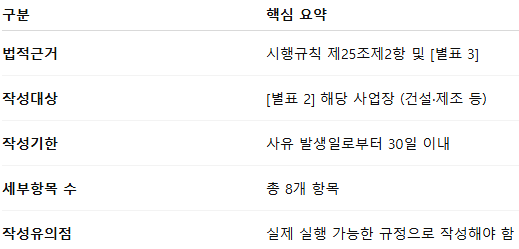 작성 대상은 [별표 2]에서 정한 건설업·제조업 등 일정 규모 이상의 사업장으로, 해당 기준에 해당하는 사업주는 사유가 발생한 날부터 30일 이내에 규정을 마련해야 합니다.