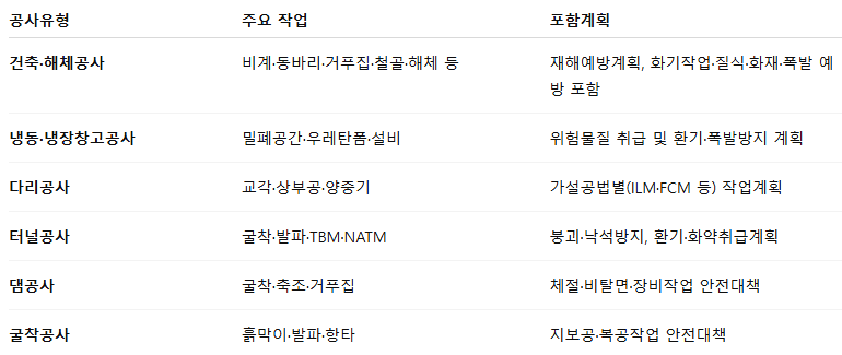 예를 들어 터널공사는 낙석·폭발·환기계획이, 해체공사는 화재·질식·동시공정 위험계획이 포함되어야 합니다.