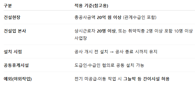 2023년 고용노동부 「산업보건실-780」 OPS 자료에 따르면 건설공사 20억 원 이상 현장부터 휴게시설 설치가 의무화되었습니다.