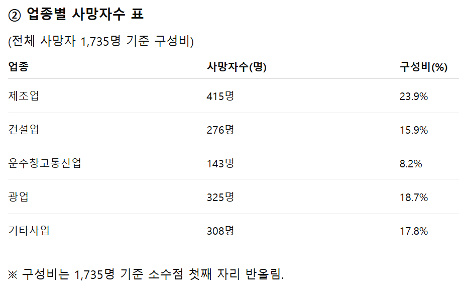 📌 제조업·건설업·광업이 전체 사망자의 58.5% 차지