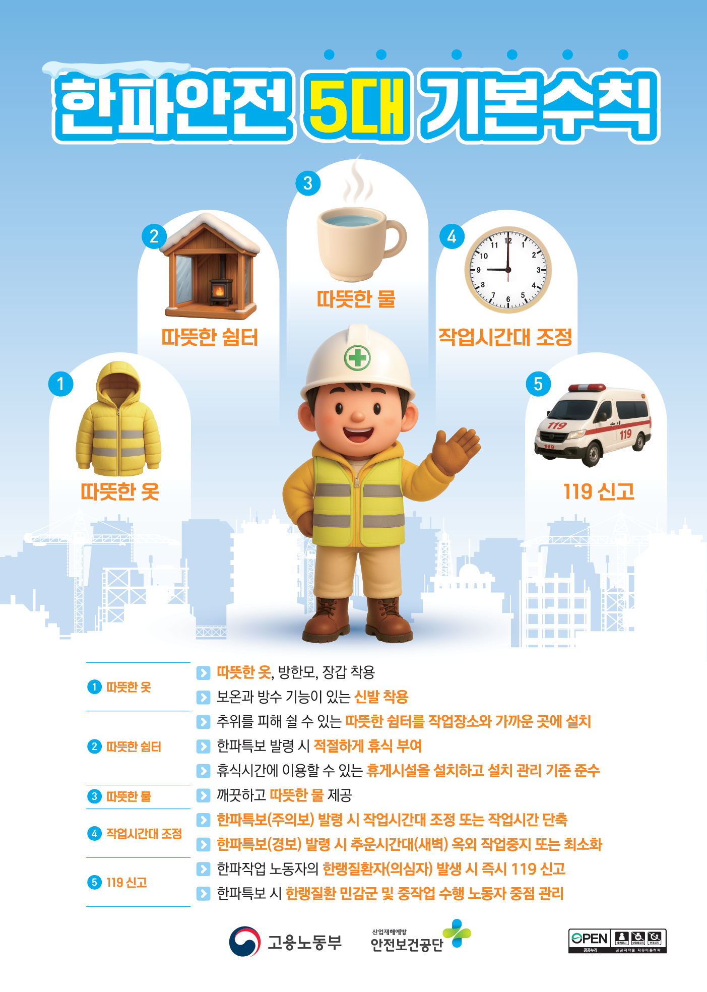 이에 따라 안전보건공단은 산업현장에서 바로 적용할 수 있도록「한파안전 5대 기본수칙」 포스터·배너·현수막을 공식 배포하고 있습니다.