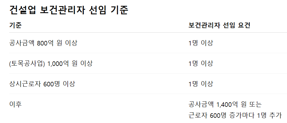 건설업은 안전관리자와 마찬가지로 공사금액 또는 상시근로자 수 기준이 적용됩니다.