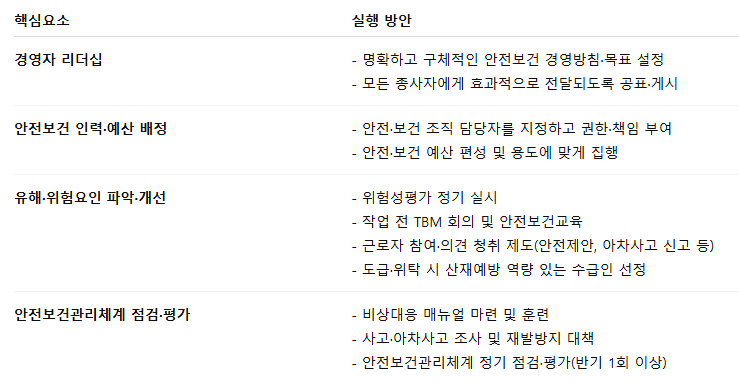 아직 대비 못하신 사업장에서는 안전보건관리체계를 구축 시 참고하시면 좋겠습니다.