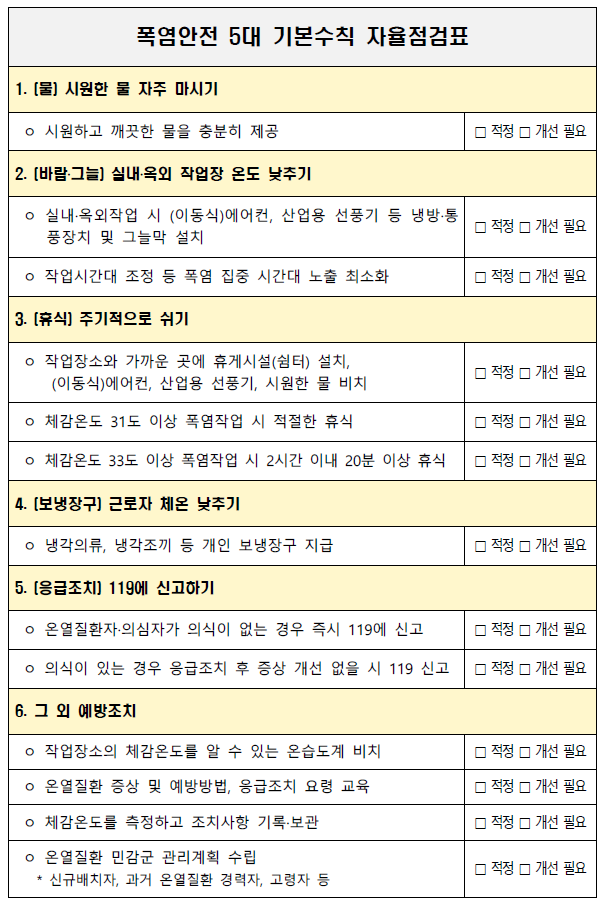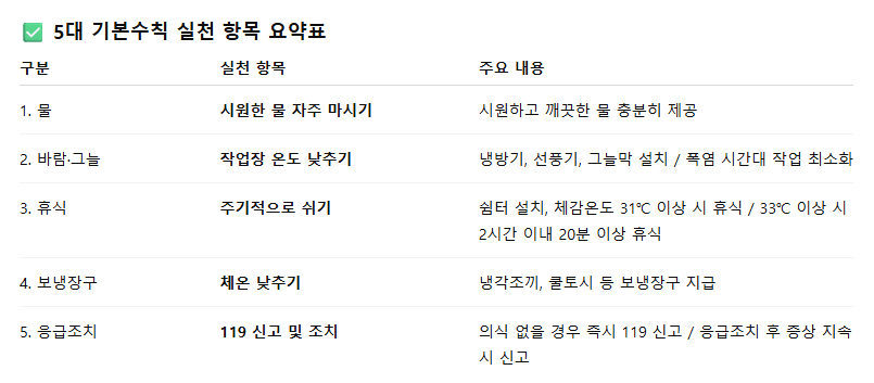 고용노동부와 안전보건공단에서 제시한 폭염안전 5대 기본수칙,