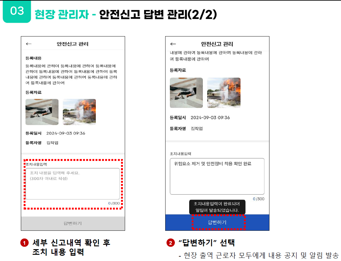 4. 안전신고 관리 - 신고 내용 확인 후 조치·답변 등록